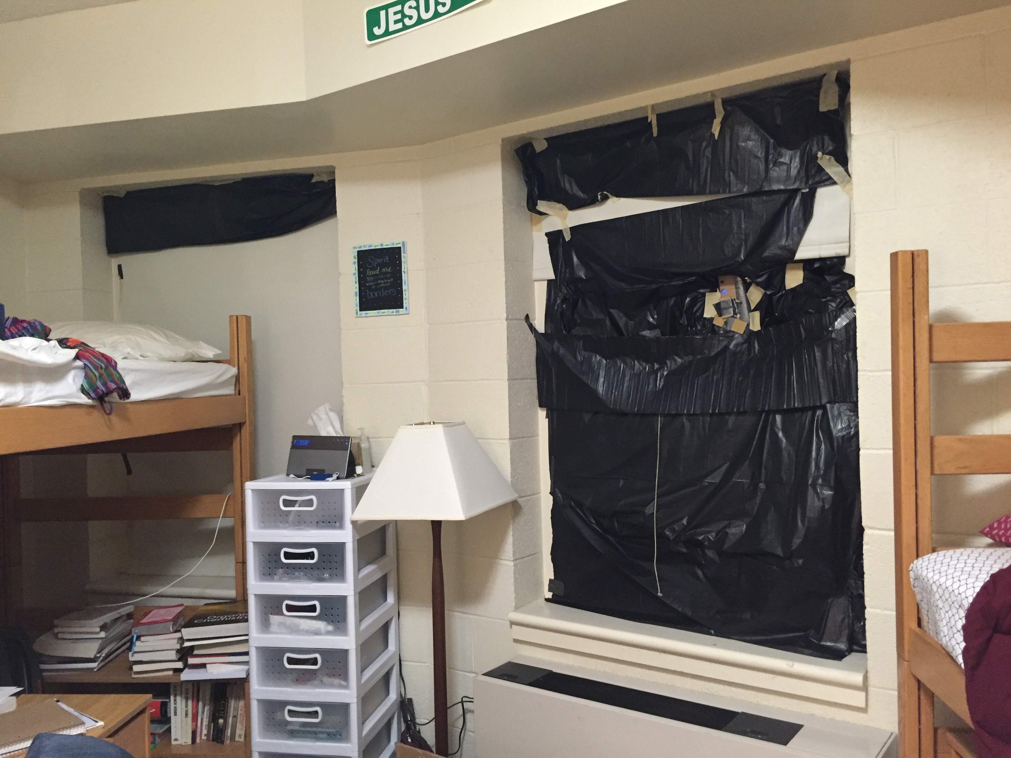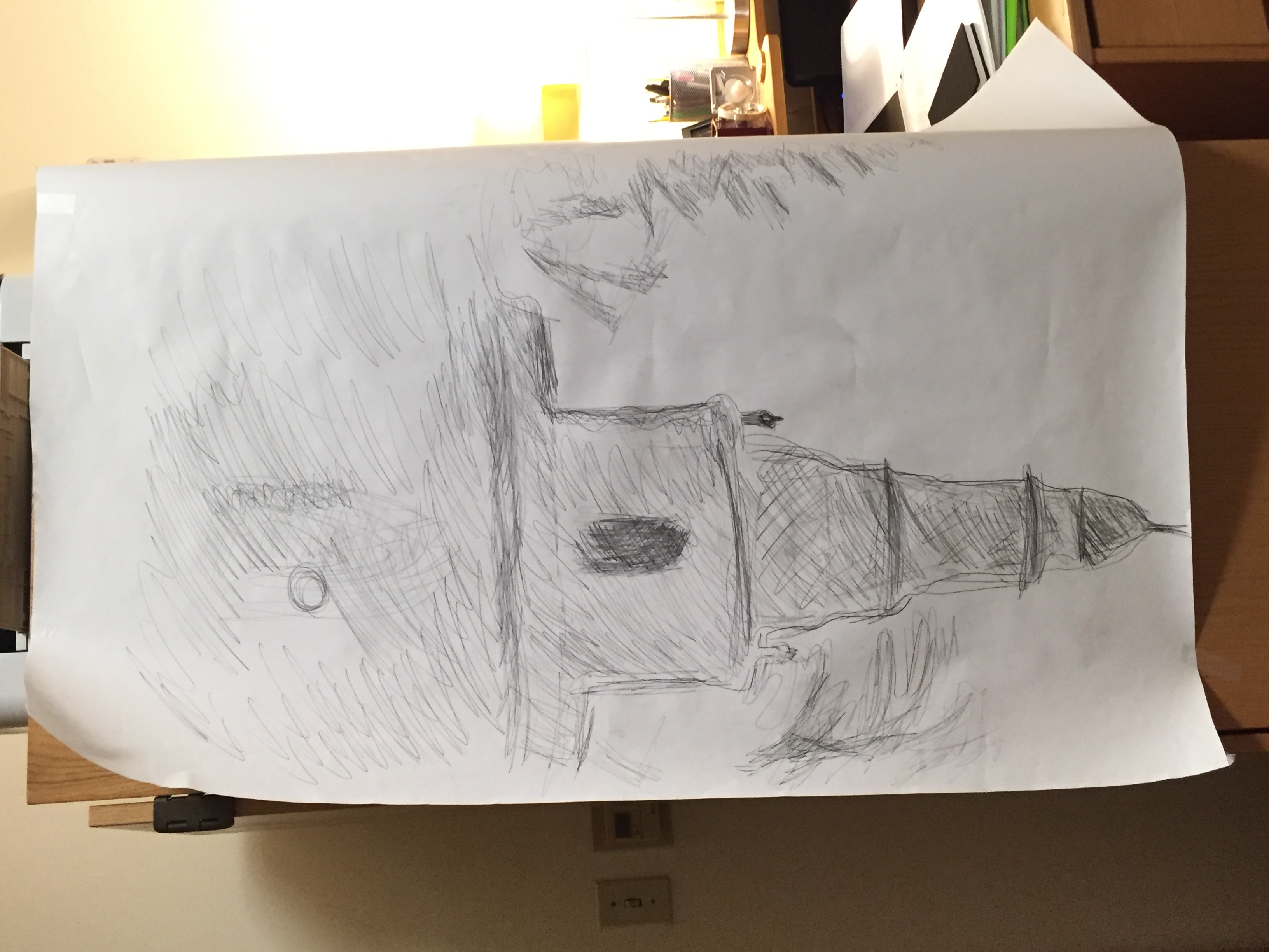 After the windows were covered, I took a trash bag and sealed the crack under the door to prevent light from entering. With the room fully dark, I opened the pin hole and began experimenting with the different diameters. After finding which diameter worked best, I attached a large piece of paper to my bureau and made a sketch of the image projected.
