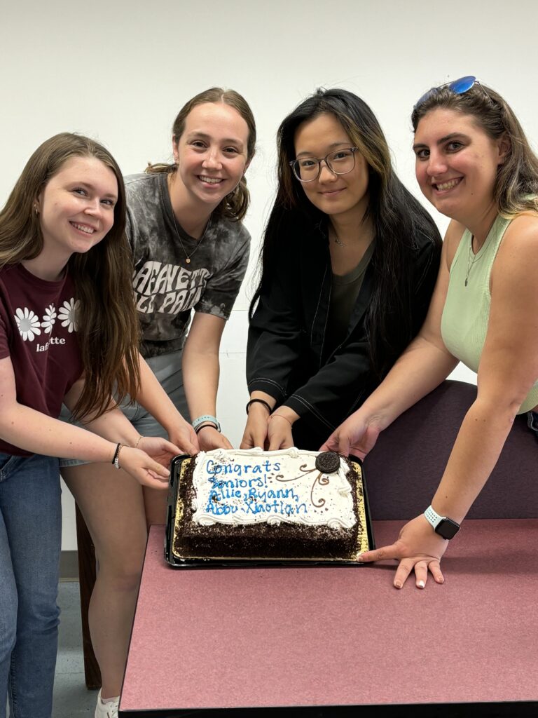 Spring 2024 – Final group meeting for our seniors. Congrats Ryann, Abby, Xiaotian and Allie!