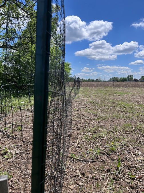 - Beginning stages of fence set-up (zoom in to see stakes). Before flail mowing. (19 April 2025)